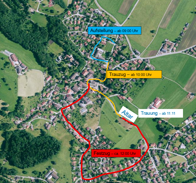 Alle die am Trauzug teilnehmen, finden sich bitte ab 09:00 Uhr um die Inntalschule ein. Der zeitliche Ablauf bis zum Festzug findet sich hier: