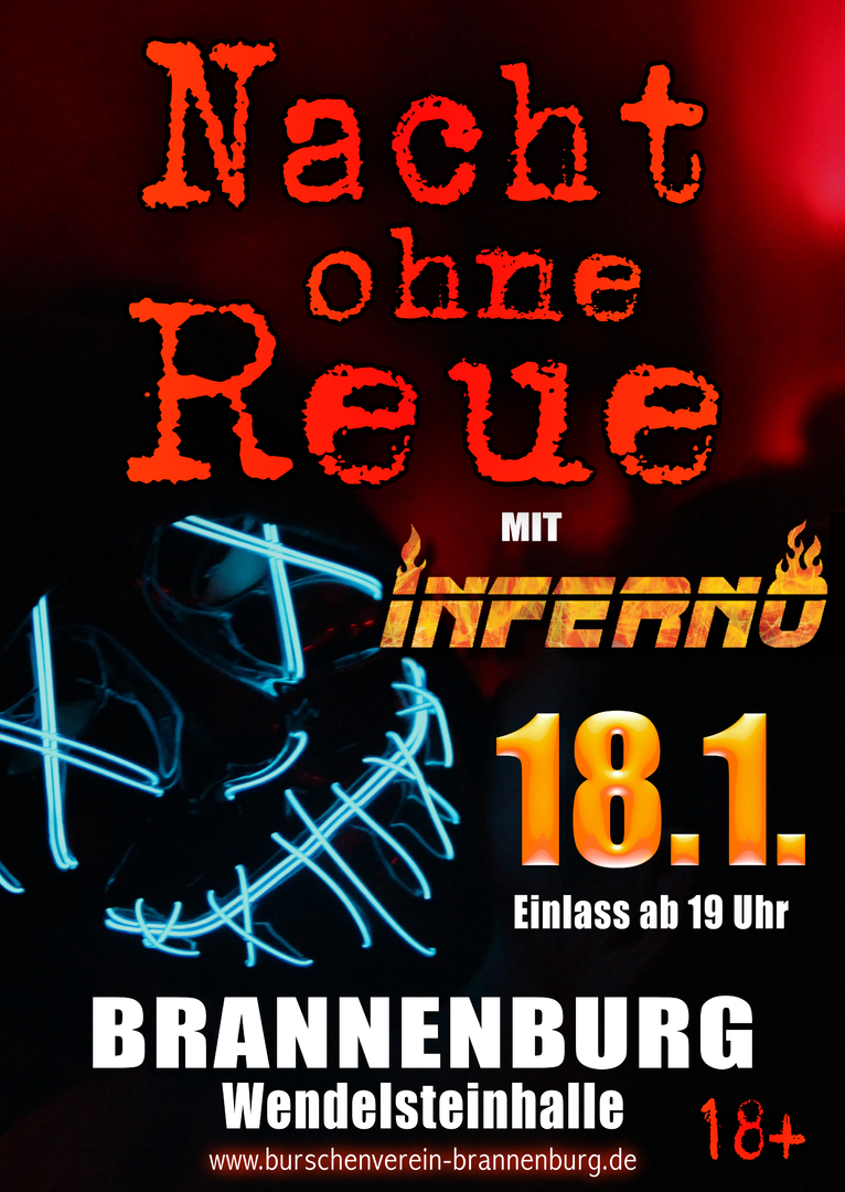 Am 18.1. ist es wieder soweit! Die Wendelsteinhalle in Brannenburg öffnet ihre Pforten zur legendären NACHT OHNE REUE mit Inferno !!!