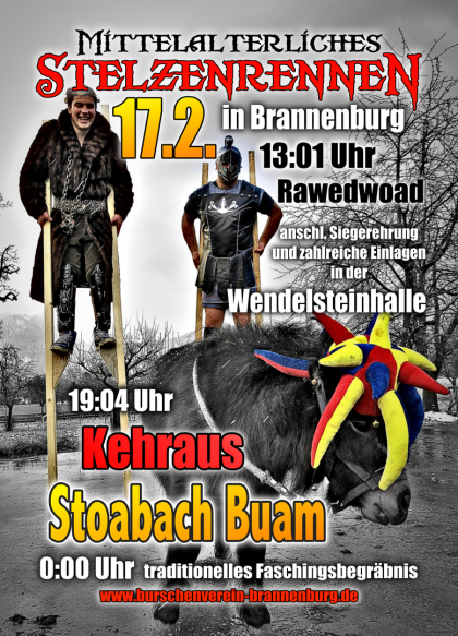 Am Faschingsdienstag laden die brannenburg Burschen wie jedes Jahr zum fröhlichen Faschingstreiben im Dorf ein. Heuer werden mittelalterliche Gestalten auf Stelzen um die Faschingskrone kämpfen ;)